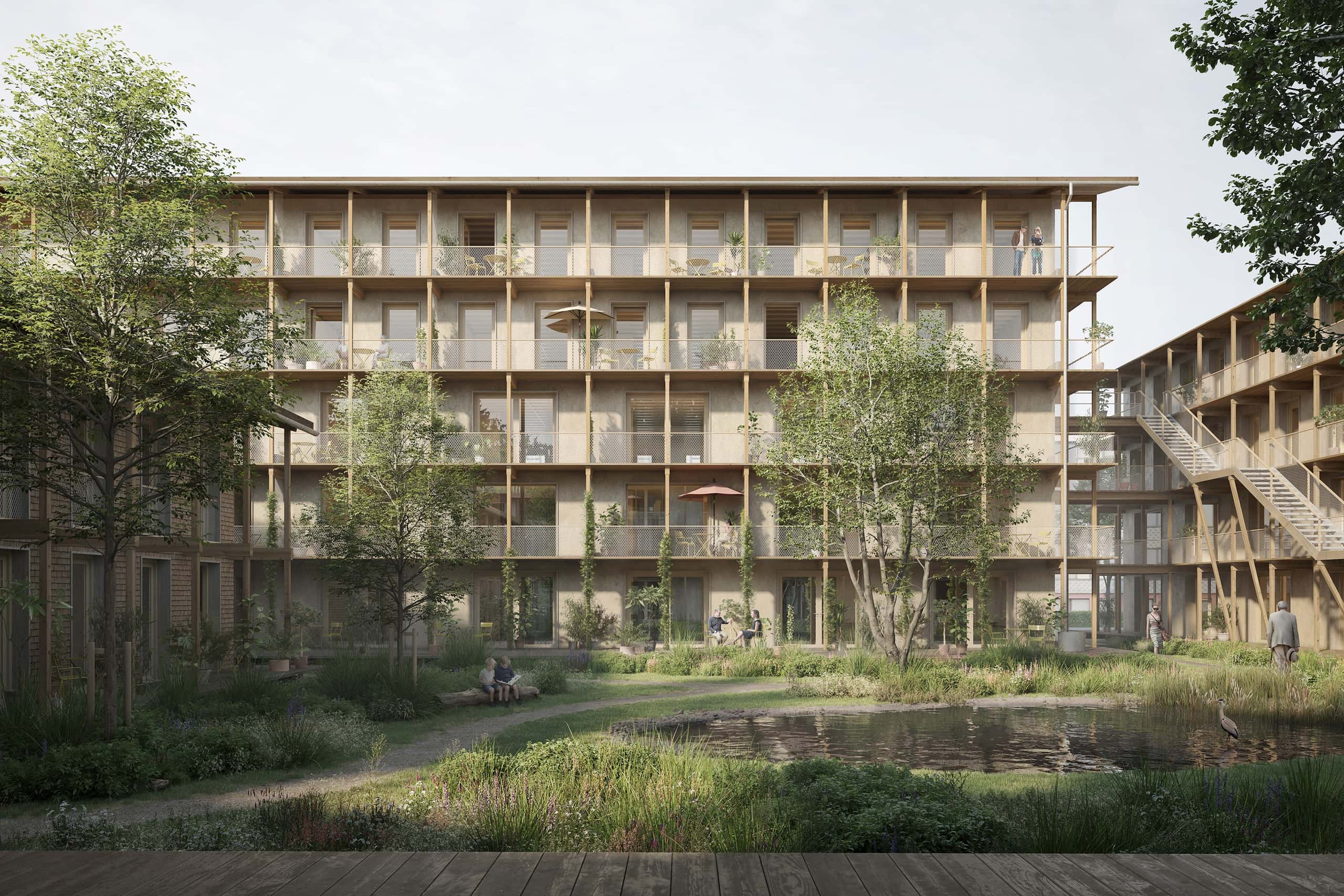 Een voorbeeld daarvan is het introduceren van Community Land Trust (CLT) in het plan: een gemeenschapsgerichte organisatiestructuur met als doel betaalbare huisvesting en gemeenschapsontwikkeling te bevorderen. “Woningen betaalbaar maken is één ding, maar door een deel van die woningen uit de sfeer van speculatie te houden, kunnen we die betaalbaarheid ook blijvend garanderen”, zegt Nauta. De CLT zorgt ook voor een duidelijke koppeling tussen bewoners en de grondstoffentransitie. “Bouwen met hernieuwbare biobased materialen levert nieuwe onderhoudscycli op. Een houten shingle gevel moet bijvoorbeeld elke dertig jaar vervangen worden. Via de CLT kunnen we een koppeling maken tussen de bewoners en een bos waar die houten shingles vandaan kunnen komen. Een andere koppeling willen we maken met de landbouw die ook voor een enorme transitieopgave staat, bijvoorbeeld voor de productie van natuurlijke isolatiematerialen als vlas en hennep.”