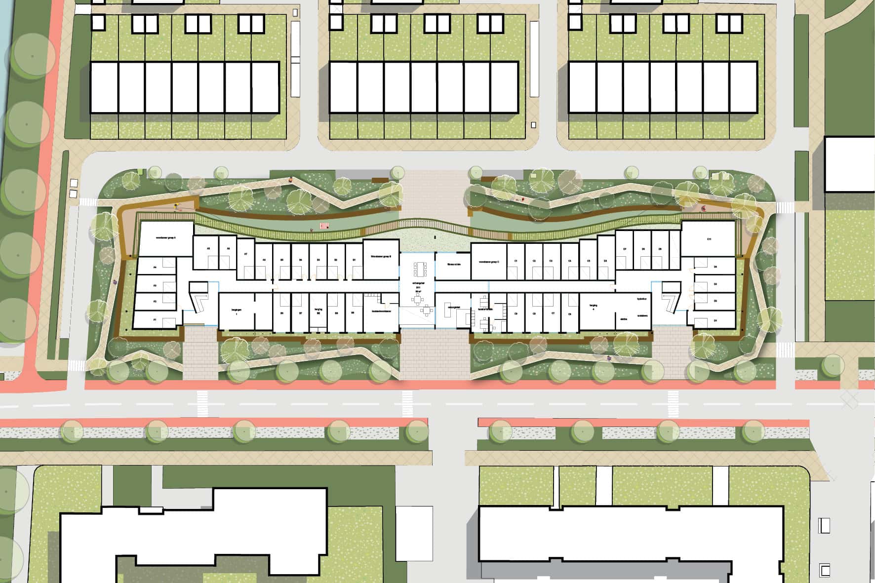 De plint is voor de woongroepen van Middin. Afzonderlijke tuintjes sluiten aan op de collectieve buitenruimte. Op de verdieping brengt een leefgalerij samenhang. Rondom de flat ziet het team meer groen, met uitnodigende wandelpaden zonder gevaarlijke oversteekpunten of interactie met verkeer, maar mét veel zitgelegenheden.