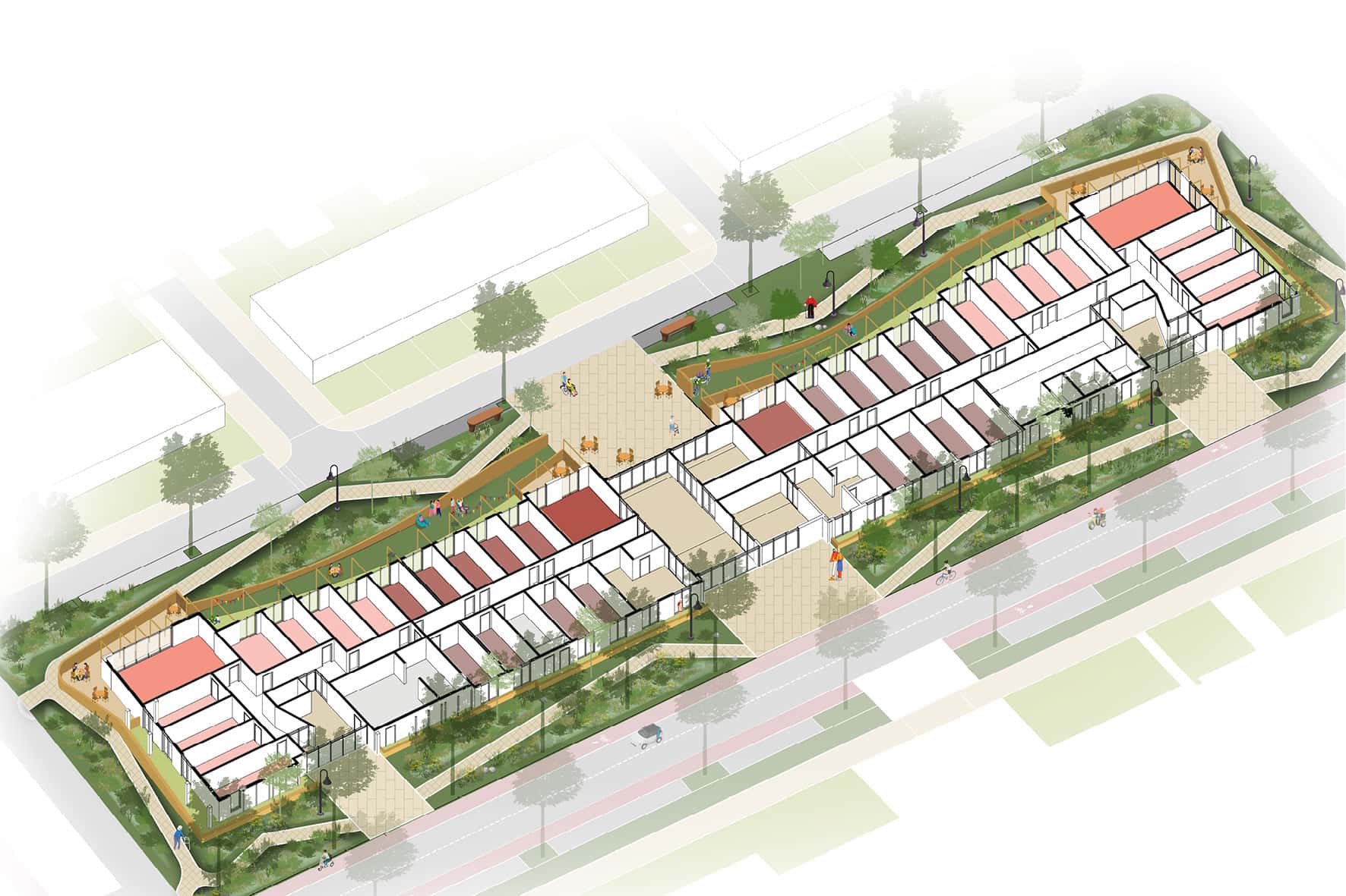 Fysieke aanpassingen aan de flat en omgeving geven letterlijk richting aan de gemeenschapsvorming en versterking van individuele mensen. Centraal staat hierin een open zone op de begane grond, die voor- en achterzijde van het pand verbindt. Hier komen bewoners naar het Ontzorgloket, drinken samen koffie, sporten en ondernemen activiteiten. De gezamenlijke tuin krijgt een schuurtje voor gereedschappen, een klusplek en een moestuin.