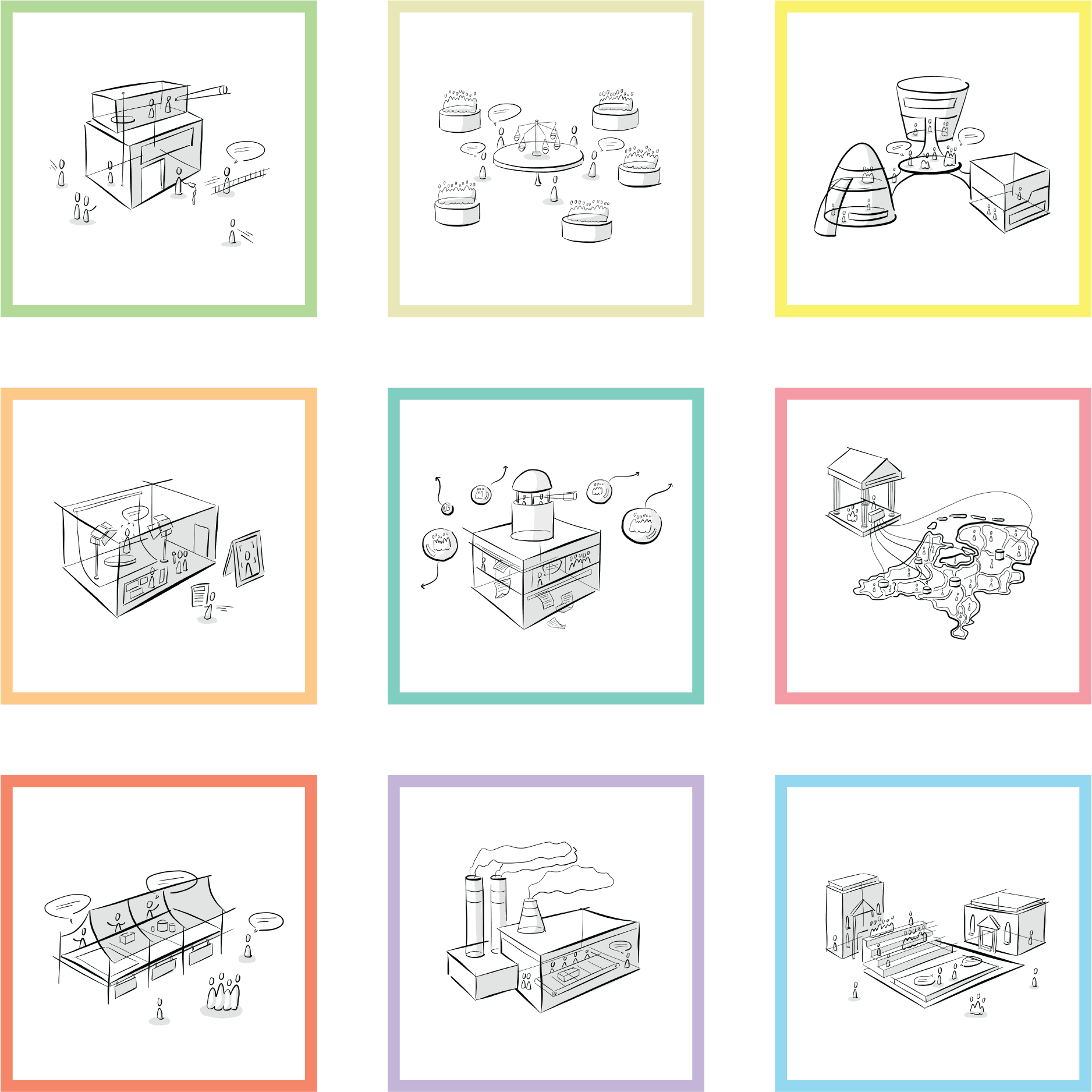 De onderzoekers van Komovo ontwierpen negen toekomstframes. In deze verhalen werkt een imaginaire schrijver uit 2050, telkens een specifieke houding van de rijksambtenaren uit ten opzichte van hun werk en de samenleving. De frames dragen beeldende titels als De rijkskazerne, De polderkamer, De rijksmarkt, De fabriek van fragiliteit en De districten-holding. Via deze frames laten de ontwerpers zien hoe de rijksambtenaren zich kunnen verhouden tot de wereld en welke ruimtelijke behoeftes daarmee gepaard gaan.