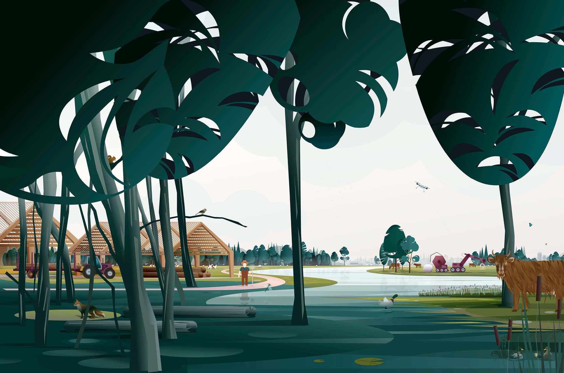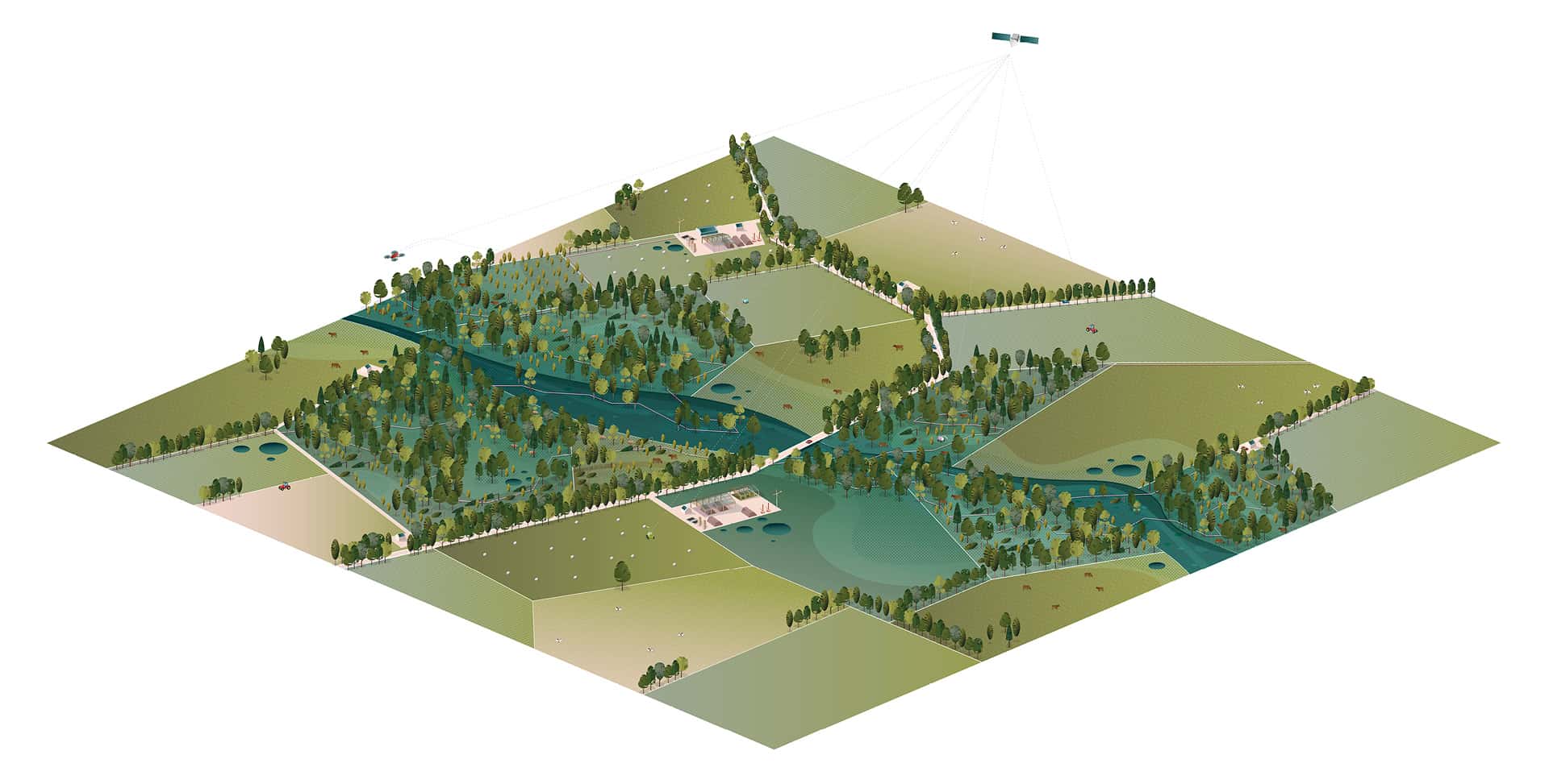 Het perspectief voor 2050 toont hoe in Salland een nieuwe balans gerealiseerd kan worden tussen landschap, schaalgrootte en agrarisch landgebruik. Vernieuwende agrarische bedrijfsmodellen ondersteunen de landschappelijke diversiteit en waarden. Het landschap, de bodem en (natuurlijke) waterhuishouding vormen het vertrekpunt voor de landbouw en scheppen de randvoorwaarden. Dat betekent akkerbouw op de hogere delen, zoals oeverwallen, dekzandruggen en enken, is gesitueerd. Dorps- en stadsranden worden beter verweven met het landelijk gebied en in de lagere, nattere delen langs de weteringen en in kwelzones ontstaat een zelfregulerend watersysteem waar natte natuur gecombineerd wordt met landbouw.